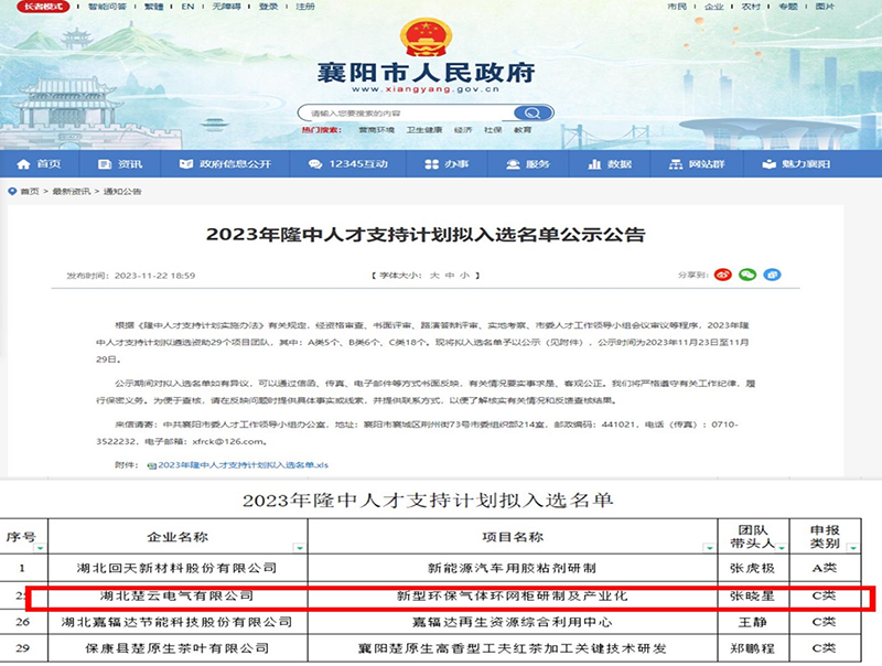 襄阳市人民政府网站信息显示,湖北楚云电气有限公司以其“新型环保气环网柜研制及产业化”项目,成功入选2023年的“隆中人才支计划”名单。